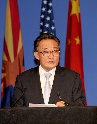 9月8日,正在美國進(jìn)行正式友好訪問的中國全國人大常委會委員長吳邦國在菲尼克斯出席中美經(jīng)貿(mào)合作論壇開幕式并發(fā)表演講。新華社記者 馬占成 攝