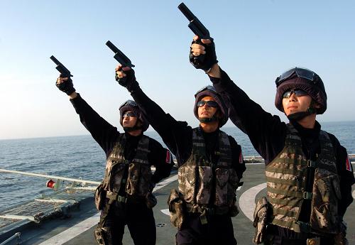 9月10日,3名中國海軍特戰(zhàn)隊(duì)員準(zhǔn)備發(fā)射中俄海軍聯(lián)合護(hù)航信號彈。新華社記者 郭剛 攝