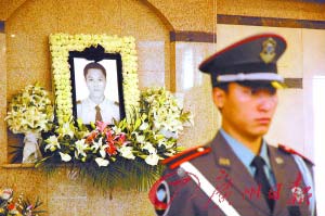 廣州保安詹斌因追搶匪而殉職,成為好保安的典范。圖為詹斌的追悼會(huì)現(xiàn)場。(資料圖片)