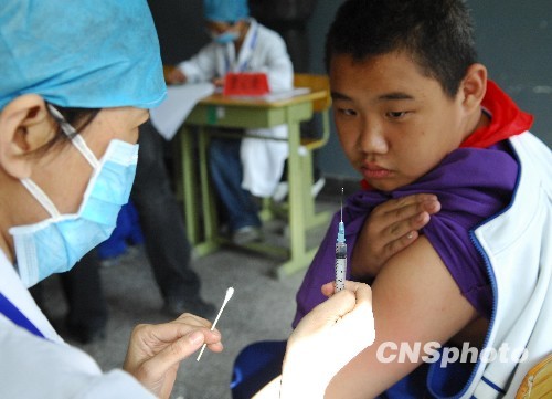 10月21日下午,北京市朝陽區(qū)垂楊柳中學(xué)初一(2)班的學(xué)生正在接種甲型H1N1流感疫苗。據(jù)北京市衛(wèi)生局介紹,從當(dāng)天起至12月31日期間,北京市的中小學(xué)生、老人等五類重點(diǎn)人群,在知情自愿的原則下,將免費(fèi)接種甲流疫苗。 中新社發(fā) 侯宇 攝