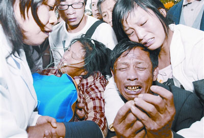 現(xiàn)場,有些失控。工作人員死死拉住陳崇香、涂月熙,并說:“節(jié)哀,節(jié)哀!”突然,傷心欲絕、痛哭中吐不過氣來的涂月熙昏倒在地,正在追悼會大廳負(fù)責(zé)醫(yī)療的荊州市醫(yī)護(hù)人員,趕緊過來給她輸氧搶救。