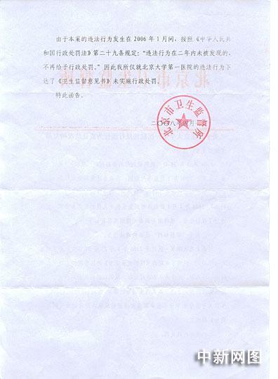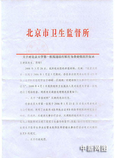 北京市衛(wèi)生監(jiān)督所的復函,熊卓為的丈夫王建國提供