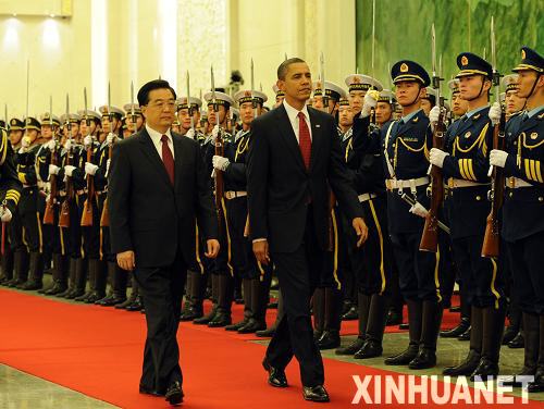 11月17日,國(guó)家主席胡錦濤在北京人民大會(huì)堂主持儀式,歡迎美國(guó)總統(tǒng)奧巴馬訪華。新華社記者 李濤 攝
