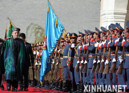 11月19日,在阿富汗首都喀布爾的阿總統(tǒng)府,阿富汗總統(tǒng)卡爾扎伊(左)在宣誓就職前檢閱儀仗隊(duì)。當(dāng)天,卡爾扎伊宣誓就職,開始其第二個5年的總統(tǒng)任期。新華社記者扎比攝