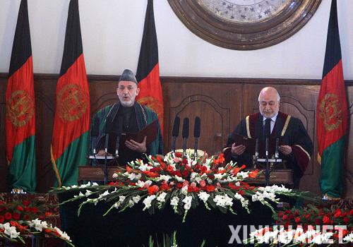 最終,卡爾扎伊在兩名副總統(tǒng)穆罕默德·法希姆和穆罕默德·卡里姆·哈利利陪同下宣誓就職。
