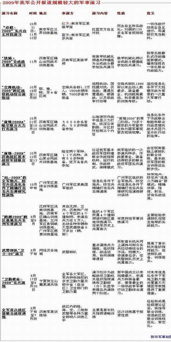 據(jù)新華軍事的不完全統(tǒng)計(jì),截至2009年11月30日,今年以來經(jīng)權(quán)威媒體公開報(bào)道的較大規(guī)模的中國軍隊(duì)參與的軍事和非軍事演習(xí)(練)就有18次。其中如"跨越2009"跨區(qū)基地實(shí)兵系列軍事演習(xí)更是受到了媒體的重點(diǎn)關(guān)注,曝光率極高。媒體報(bào)道的內(nèi)容很非常的寬泛,從行軍過程,到士兵裝具的變化,再到演習(xí)過程的記者目擊,讀者通過這些報(bào)道可以了解到演習(xí)的很多細(xì)節(jié)。