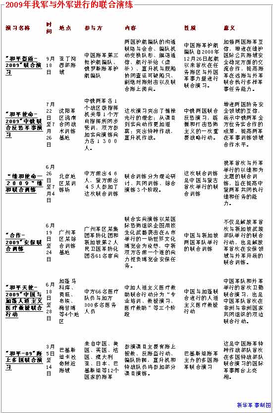 此外,今年中國軍隊(duì)還參與了6次中外聯(lián)合軍事演練(習(xí))。其中有多個"首次"--中國特種部隊(duì)首次亮相國際軍演舞臺,中國軍隊(duì)首次與外軍進(jìn)行衛(wèi)勤聯(lián)合演練,解放軍首次與外軍進(jìn)行安保領(lǐng)域聯(lián)合訓(xùn)練,我軍與外軍的首次維和聯(lián)合訓(xùn)練。聯(lián)合演習(xí)中的重頭戲是,"和平使命-2009"中俄聯(lián)合反恐軍事演習(xí)。