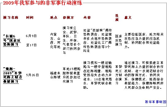 2009年中國軍隊(duì)參與了一些非軍事行動演練,規(guī)模較大的有"長城6號"國家反恐怖演習(xí)和"鷺海-2009"軍警民海上聯(lián)合救援演習(xí)。