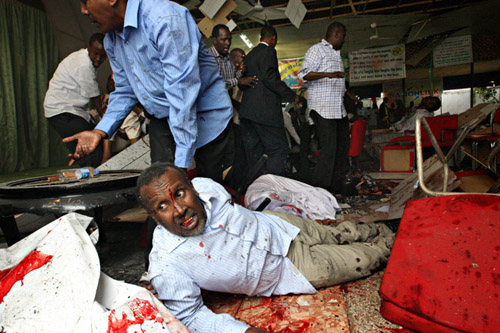 爆炸發(fā)生在摩加迪沙當(dāng)?shù)赜忻摹吧衬频辍,索馬里貝納迪爾大學(xué)計(jì)算機(jī)和工程系的學(xué)生正在酒店新裝修過的舞廳里舉行畢業(yè)典禮,不料儀式進(jìn)行到一半時(shí)現(xiàn)場發(fā)生劇烈的爆炸。據(jù)悉,雖然只有43名大學(xué)生當(dāng)天畢業(yè),但邀請(qǐng)的賓客很多,多名索過渡政府要員參加了典禮。