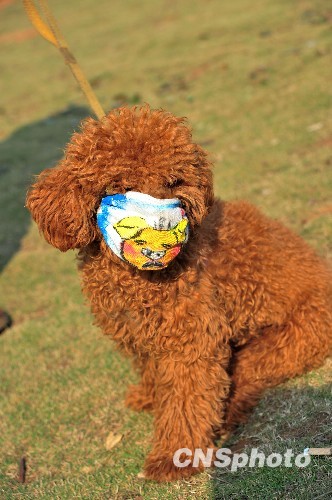11月24日,在湖北恩施市鳳凰山森林公園內,一只寵物狗被主人穿上保暖衣、戴上口罩,在草坪上曬太陽。狗的主人說,在網(wǎng)上看到世衛(wèi)組織專家告誡寵物也要防甲流的消息后,每次外出遛狗時,他就給寵物狗穿上保暖衣、戴上自制的口罩。 中新社發(fā) 楊順丕 攝