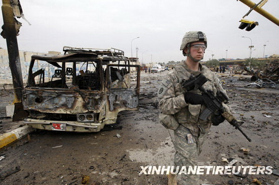 12月8日,一名美國(guó)士兵從伊拉克首都巴格達(dá)北部地區(qū)發(fā)生炸彈襲擊的現(xiàn)場(chǎng)走過(guò)。