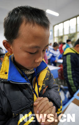 12月8日,事發(fā)學校的一名學生在上課前為死難同學默哀。新華社記者 趙眾志 攝 資料圖