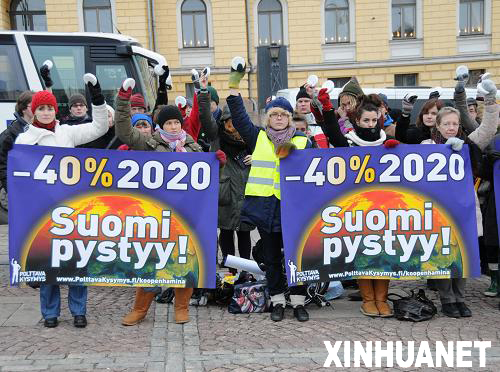 12月12日,近百名民眾在芬蘭首都赫爾辛基市中心廣場拉響警報器,向人們發(fā)出氣候變化的警報。當天,在哥本哈根舉行聯(lián)合國氣候變化大會之際,芬蘭全國14個城市同時舉行由“芬蘭地球之友”等民間組織發(fā)起的環(huán)保示威集會,要求聯(lián)合國氣候變化大會達成一項具有法律效力的協(xié)議,使發(fā)達國家承擔起到2020年將溫室氣體排放量在1990年的基礎上減少40%的義務,并每年至少向發(fā)展中國家提供1100億歐元的氣候援助資金。新華社記者趙長春攝