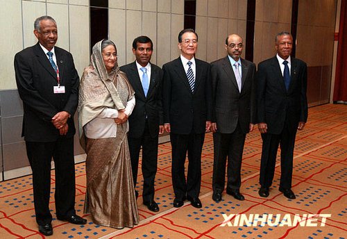 12月17日,中國國務院總理溫家寶在丹麥首都哥本哈根會見馬爾代夫總統(tǒng)納希德(左三)、孟加拉國總理哈西娜(左二)、埃塞俄比亞總理梅萊斯(右二)、格林納達總理托馬斯(右一)、蘇丹總統(tǒng)助理納菲阿(左一)等領導人。這是會見前合影。新華社記者龐興雷攝