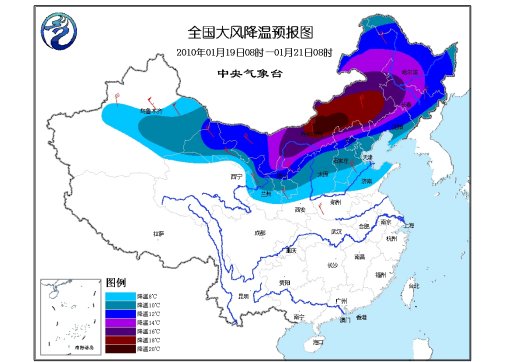 19日08時至21日08時,新疆東部和沿天山地區(qū)、西北地區(qū)東部、內(nèi)蒙古、華北、東北、黃淮北部等地自西向東將先后有5~6級、陣風(fēng)7~8級偏北風(fēng),新疆山口地區(qū)風(fēng)力可達(dá)8~10級;上述地區(qū)的氣溫將下降8~12℃,其中,內(nèi)蒙古中東部、東北地區(qū)西部的部分地區(qū)溫度降幅可達(dá)14~18℃,局部地區(qū)有18~20℃。20日早晨,阿勒泰地區(qū)的最低氣溫將下降到零下35至零下43℃。20日、21日早晨,內(nèi)蒙古東北部的最低氣溫也將下降到零下30至零下35℃,局地達(dá)零下40℃。