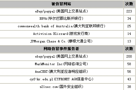 圖為向國家互聯(lián)網(wǎng)應(yīng)急中心投訴網(wǎng)絡(luò)仿冒事件的國外機構(gòu)排名前五位以及被仿冒網(wǎng)站的前五名