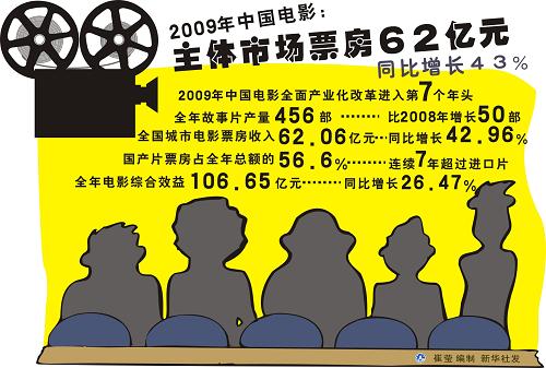 圖表:2009年中國電影:主體市場票房62億元。新華社發(fā)