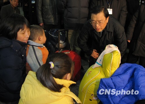1月26日,中共中央政治局委員、國務(wù)院副總理張德江在北京西客站與一對(duì)候車準(zhǔn)備回家的豫籍農(nóng)民工一家交談。當(dāng)日,張德江一行抵達(dá)北京西站,視察了應(yīng)急指揮中心,聽取了北京西站春運(yùn)工作匯報(bào),到候車室看望了候車旅客,到售票窗口了解車票發(fā)售情況。 中新社發(fā) 曹巍嵩 攝