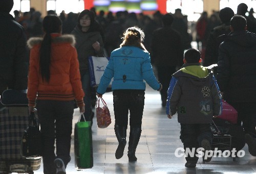 1月21日,一對(duì)母子在北京站準(zhǔn)備上車。北京鐵路局根據(jù)北京地區(qū)客流特點(diǎn)宣布,從1月20日起北京鐵路運(yùn)輸部門進(jìn)入春運(yùn)狀態(tài),這比全國春運(yùn)提前了10天,春運(yùn)將一直持續(xù)到3月10日。 中新社發(fā) 蘇丹 攝