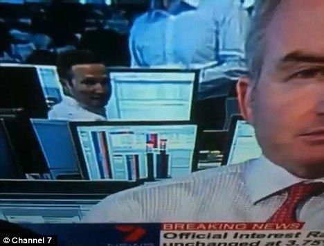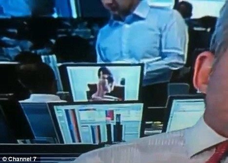 澳大利亞電視七臺2日在麥格理銀行拍攝一期新聞訪談節(jié)目。一名工作人員接受電視臺采訪談論澳大利亞經(jīng)濟時,另一名職員在一旁點開澳大利亞名模米蘭達·克爾一組幾乎全裸照片瀏覽,全然不知自己已成為新聞“背景”。