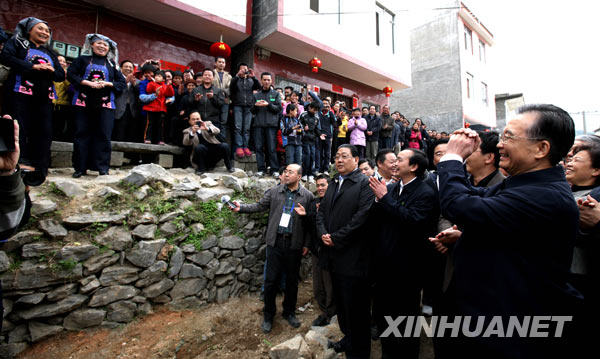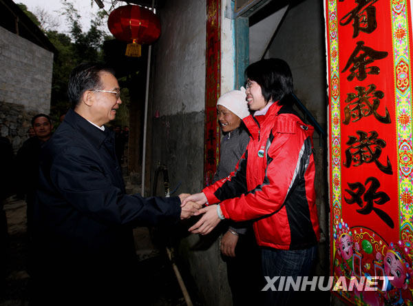 2月12日至14日,新春佳節(jié)到來之際,中共中央政治局常委、國務(wù)院總理溫家寶來到廣西壯族自治區(qū)河池、百色等地,看望慰問各族群眾,共迎虎年春節(jié)。這是2月12日,溫家寶來到位于大山深處的東蘭縣三石鎮(zhèn)巴造村,向村民致以節(jié)日的問候。新華社記者姚大偉攝