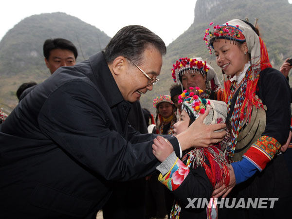 2月12日至14日,新春佳節(jié)到來之際,中共中央政治局常委、國務(wù)院總理溫家寶來到廣西壯族自治區(qū)河池、百色等地,看望慰問各族群眾,共迎虎年春節(jié)。這是2月13日,溫家寶來到巴馬瑤族自治縣東山鄉(xiāng)卡橋村巴根瑤寨,看望瑤族群眾。新華社記者姚大偉攝