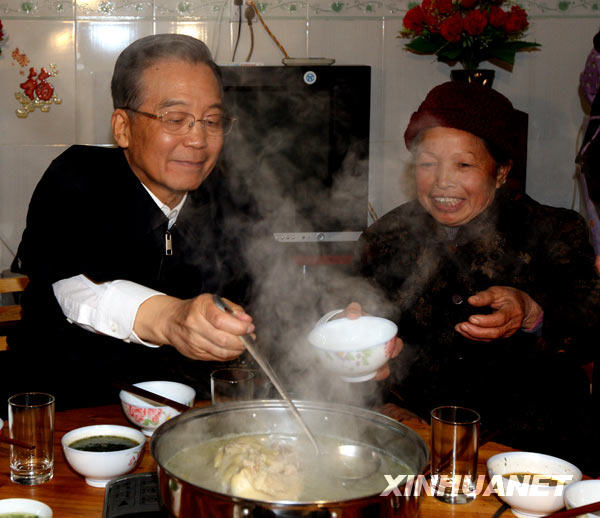 練鄉(xiāng)村同賀屯是一個有22戶人家的小村落。暮色逐漸降臨,溫家寶來到這里看望群眾,祝福新年。總理的到來,使小村莊沸騰了,人們紛紛向總理致意。已近晚上7時,溫家寶來到村民藍慶明家,和一家人熱熱鬧鬧吃起了年夜飯。餐桌上,不時傳出開心的笑聲。屋外,歡慶的鞭炮聲響起,此起彼伏,象征著人們對未來的美好向往……