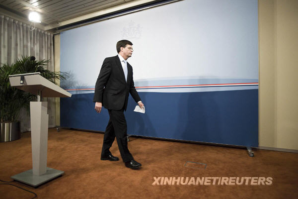 2月20日,荷蘭首相巴爾克嫩德在海牙召開(kāi)新聞發(fā)布會(huì)后離開(kāi)。當(dāng)日,巴爾克嫩德宣布,由于在阿富汗撤軍問(wèn)題上無(wú)法達(dá)成一致,執(zhí)政聯(lián)盟中第二大黨工黨將退出執(zhí)政聯(lián)盟,致使執(zhí)政聯(lián)盟解體。新華社/路透