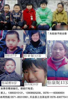 20日上午10點(diǎn)左右,有人給蔡修明的弟媳打來電話,說在三門縣嶺口見過5個(gè)孩子,可蔡家人到嶺口未見孩子的蹤影。這時(shí),從嶺口發(fā)往寧海桑洲的一位司機(jī)說看到過5個(gè)小孩乘中巴車已到寧海。蔡家親戚趕往當(dāng)?shù)嘏沙鏊{(diào)取了當(dāng)時(shí)的監(jiān)控錄像,但錄像比較模糊,不能確定那就是走失的蔡家姐弟。