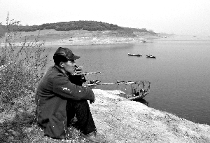 均縣鎮(zhèn)蓮花池村的陳永兵在碼頭等待兒子歸來(lái),他們一家今年3月也要移民到宜城鄧林農(nóng)場(chǎng)?阻 攝