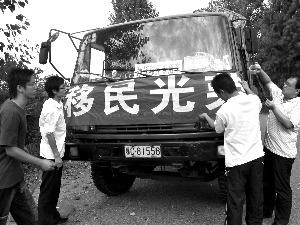 均縣鎮(zhèn)政府工作人員為搬家卡車掛上標(biāo)語(yǔ)。