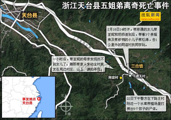 18日下午,居住在浙江天臺縣下路王村的蔡家5名孩子外出玩耍,臨行前,告知奶奶王東英要去同誼村找同學(xué),隨后就再也沒有歸來。22日,5名孩子的尸體在龍珠潭水庫下游魚塘蓄水池被發(fā)現(xiàn)。昨日下午3時,浙江天臺縣公安局就“二·一八”事件第四次召開新聞發(fā)布會,通報5名失蹤兒童尸檢初步結(jié)果,均發(fā)現(xiàn)孩子在肺部出現(xiàn)水氣腫,并有大量積水,尸體無外傷、扼頸跡象。警方初步調(diào)查稱5名兒童為意外溺亡,具體死亡原因要等到尸檢報告出來后才能最終確定。據(jù)悉,相關(guān)死因?qū)⒂诮袢展肌?/P>