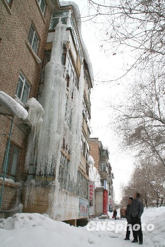 由于近期氣溫逐漸轉(zhuǎn)暖,新疆阿勒泰市團結(jié)路的一戶居民樓上出現(xiàn)“冰瀑”奇觀,吸引路人駐足觀看。據(jù)當?shù)鼐用窠榻B,白天樓頂?shù)难┤诨芸欤搅艘归g氣溫降低,融化的雪水逐漸結(jié)成冰柱形成“冰瀑”,蔚為壯觀。 中新社發(fā) 唐曉波 攝
