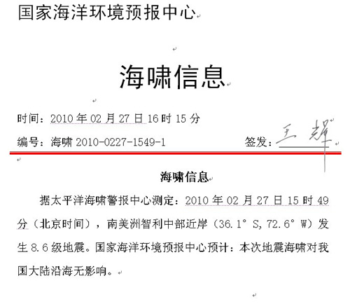 記者在國(guó)家海洋環(huán)境預(yù)報(bào)中心網(wǎng)站海嘯警報(bào)欄目中看到,這份編號(hào)為海嘯2010-0227-1549-1的海嘯信息是于27日16時(shí)15分發(fā)布的,簽發(fā)人為王輝。據(jù)媒體報(bào)道,王輝任國(guó)家海洋環(huán)境預(yù)報(bào)中心常務(wù)副主任。