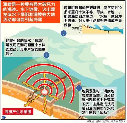 海嘯是由海底地震、火山爆發(fā)、海底滑坡等產(chǎn)生的破壞性海浪。在深海大洋,海嘯波以每小時(shí)800 公里以上的速度傳播,但波高卻只有幾十厘米或更小。當(dāng)海嘯波移近岸邊淺水區(qū)時(shí),波速會(huì)減慢,波高陡增,可形成十?dāng)?shù)米或更高的水墻。隨著海嘯波向陸移動(dòng),由于受海灣、海港或?yàn)a湖等特殊地形的影響,海嘯波的高度會(huì)進(jìn)一步上升。據(jù)觀測(cè),大海嘯的波高可達(dá)30 米以上。即使波高只有3至6米的海嘯,也極具破壞力,可造成嚴(yán)重傷亡。