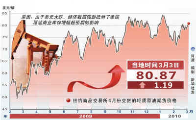 3月4日,受到歐元兌美元走高的影響,紐約原油日略有下跌,不過(guò),依然徘徊在80美/桶元上下。前一日,國(guó)際油價(jià)沖高至每桶80.87美元。