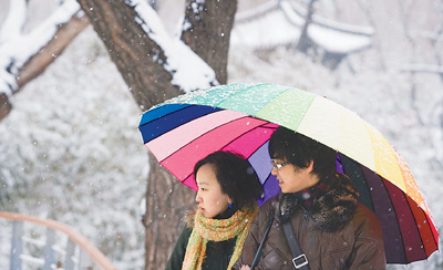 3月14日,北京飄起雪花,一對情侶在雪中散步。吳家翔攝 (人民圖片)