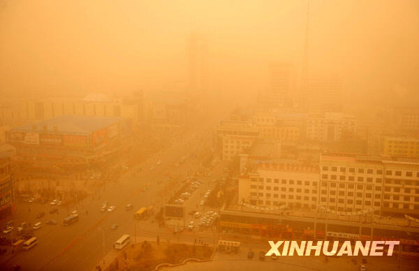 3月19日,巴彥淖爾市臨河區(qū)籠罩在濃濃的沙塵中。新華社記者 任軍川攝