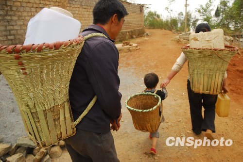 云南干旱災(zāi)情持續(xù),截至3月18日,旱情已造成全省16個(gè)州市2405萬(wàn)人受災(zāi),有811萬(wàn)人、539萬(wàn)頭大牲畜飲水出現(xiàn)困難,農(nóng)作物受災(zāi)面積達(dá)4668萬(wàn)畝。圖為從3公里之外的取水點(diǎn)背水回家的一家三口。 中新社發(fā) 田洪 攝