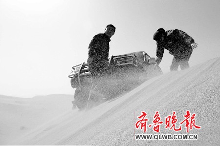 “這是最好走的路!绷_師傅說,沙漠里牧民出行基本上都是走這條“路”。途中,車陷入軟沙中兩次,下車后,沙子直往鼻孔里、耳朵里和眼睛里鉆,抽在臉上像針扎。羅師傅趴在沙堆里,扒開輪子下面的沙子,不慌不忙。