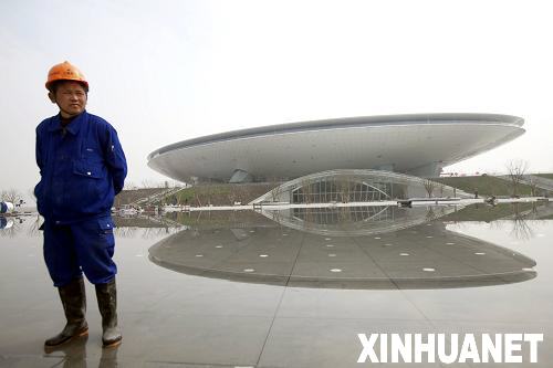 3月31日,位于上海世博會浦東園區(qū)、造型呈飛碟狀的世博文化中心正式竣工,一名工人在世博文化中心前留影。據(jù)悉,上海世博會將于4月20日啟動試運行,預計園區(qū)內(nèi)七成展館將參加試運行。目前,世博園區(qū)建設已臨近尾聲,園區(qū)內(nèi)配套設施基本建成,布展工作正在抓緊進行。新華社發(fā)(黃炎 攝)