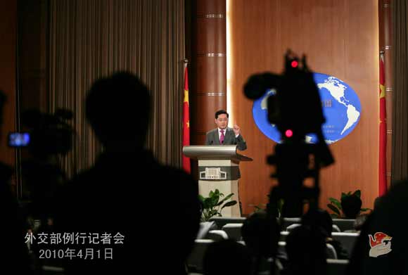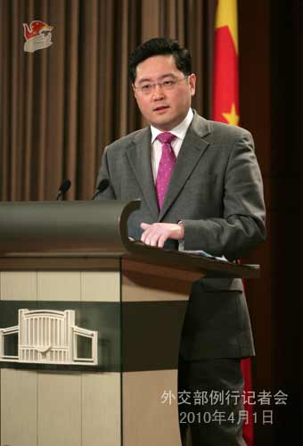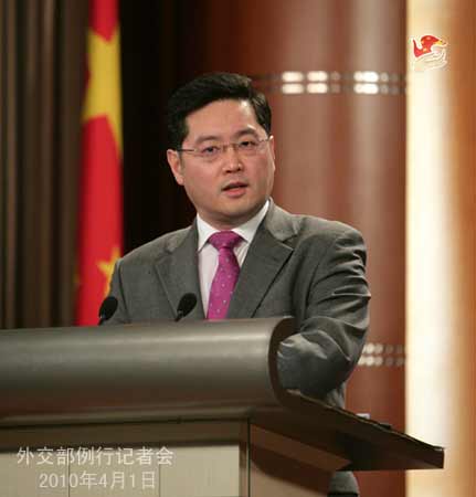 人民網(wǎng)北京4月1日電 據(jù)外交部網(wǎng)站消息,2010年4月1日,外交部發(fā)言人秦剛舉行例行記者會。答問如下。