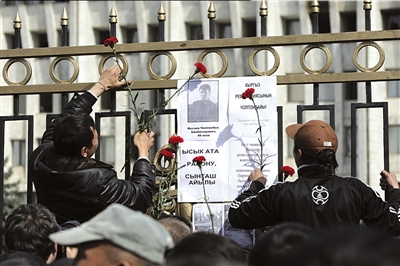 9日,比什凱克民眾在總統(tǒng)府的柵欄上插上鮮花,悼念死難者。圖/人民圖片