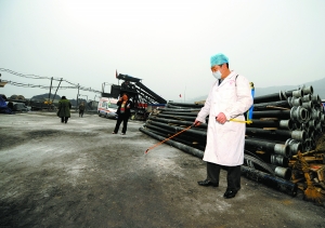 昨日,一名醫(yī)務(wù)人員正在王家?guī)X煤礦井口附近噴灑消毒藥水。當(dāng)日,事故遇難人數(shù)上升至33人。新華社記者燕雁攝