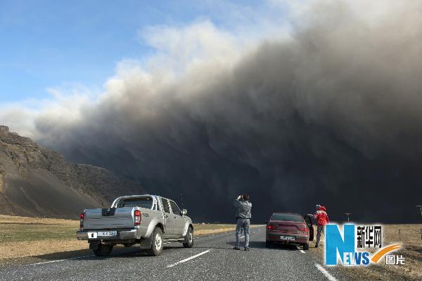 4月17日,在冰島,人們停車拍攝空中彌漫的濃厚火山灰粉塵。據(jù)專家預(yù)測(cè),冰島火山灰影響歐洲空中交通的情況還將持續(xù)數(shù)日。目前仍有近20個(gè)歐洲國(guó)家因火山灰影響實(shí)行航空管制。 新華社/法新