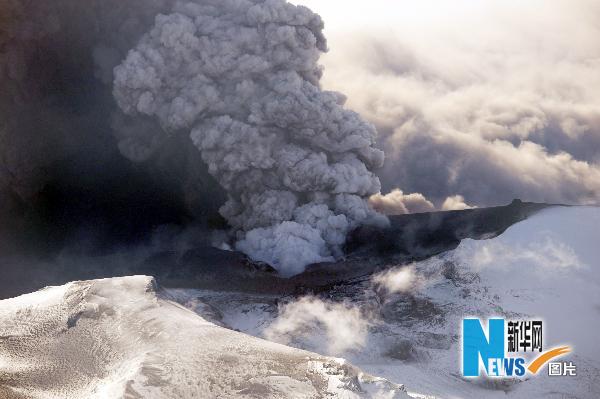 4月17日,在冰島,一名飛行員在空中拍攝噴發(fā)的火山。 新華社/法新