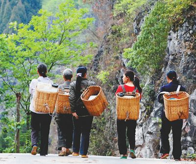冷洞村村民背著盛水工具準(zhǔn)備取水澆灌金銀花。