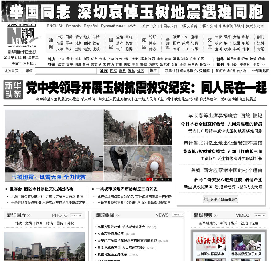 在這個(gè)全國哀悼遇難同胞的日子,網(wǎng)絡(luò)上一切與娛樂有關(guān)的活動(dòng)將全部暫停,悼念玉樹遇難同胞的主題活動(dòng)相繼展開。今天,新華網(wǎng)、人民網(wǎng)、搜狐、新浪等各大網(wǎng)站將紛紛蒙上黑灰色的面紗以托哀思。
