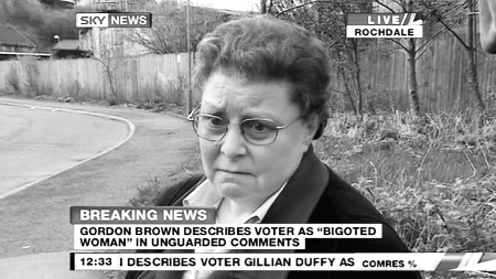 英國(guó)首相戈登·布朗28日造訪社區(qū)為選舉造勢(shì),遭一名66歲女性工黨擁躉詰問。布朗與助手私下交談時(shí)稱這名女性是“偏執(zhí)狂”,不料所戴麥克風(fēng)未關(guān)閉,對(duì)話遭媒體曝光,引起軒然大波。布朗隨即多番道歉,竭力彌補(bǔ)失言所造成損失。