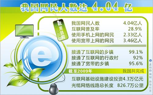 據(jù)介紹,截至2009年,我國共完成互聯(lián)網(wǎng)基礎(chǔ)設(shè)施建設(shè)投資4.3萬億元,建成光纜網(wǎng)絡(luò)線路總長度達826.7萬公里。目前,我國99.1%的鄉(xiāng)鎮(zhèn)和92%的行政村接通了互聯(lián)網(wǎng),95.6%的鄉(xiāng)鎮(zhèn)接通了寬帶。3G網(wǎng)絡(luò)已基本覆蓋全國;ヂ(lián)網(wǎng)基礎(chǔ)設(shè)施的完善大大促進了互聯(lián)網(wǎng)的普及和應(yīng)用。